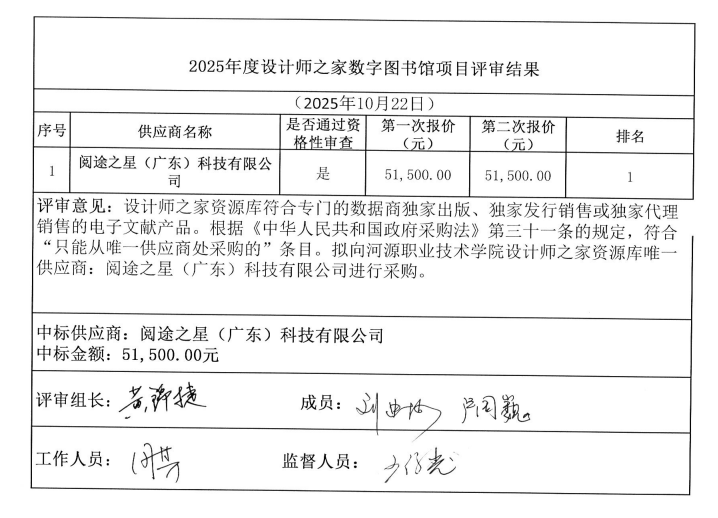2025年度设计师之家数字图书馆项目单一来源采购评审结果