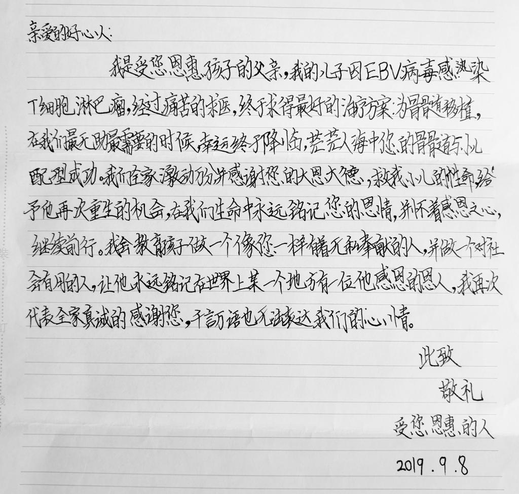 这是一封来自造血干细胞受捐赠者家属的的感谢信,他们感谢的对象是来自河职院艺术与设计学院音乐教育2017级学生黄应光同学--河职院在校大学生捐献造血干细胞的第一人。
