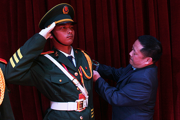我校国旗护卫队教官黄旺庆为退役队员颁授徽章