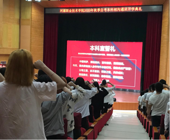 最后,新生代表陈恩杰、老生代表梁淑华同学分别做了发言。陈恩杰同学激励同学们要相信自己,努力付出必定会有好的回报。梁淑华同学表示报读本科让自己变得更加优秀,并引导全体新生进行本科学习宣誓,让2020级本科新同学明白本科学习的目标和使命,激励大家志存高远、负重前行,在努力完成专科学业的同时完成本科课程学习,实现专本同读。