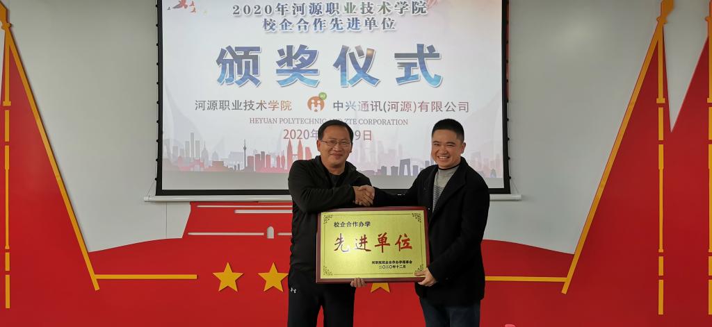 在接下来的仪式上,由袁光华副校长、 中兴通讯(河源)有限公司李新华部长和18移动通信技术1班的江仕良同学一起完成了第四届“中兴订单班”三方协议签订仪式,全体与会人员一起见证了三方签约的神圣时刻。接着,本仪式又举行了2020年乐动在线登录_乐动(中国)校企合作先进单位颁奖仪式,由袁光华副校长向中兴通讯(河源)有限公司李庆琰部长颁发了奖牌,现场响起了热烈的掌声。