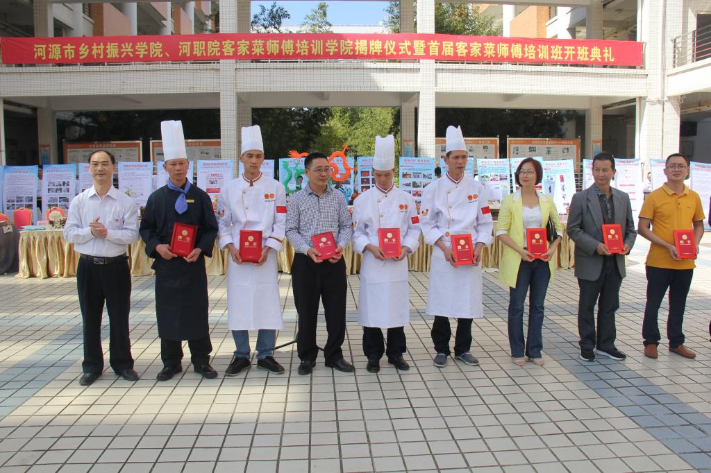 市乡村振兴指挥部、市委农办、市人力资源和社会保障局、市农业局、市扶贫办、灯塔盆地国家现代农业示范区管委会、市教育局、市旅游局、市妇联、市总工会、团市委、市技师学院、市理工学校、市卫生学校、市餐饮协会、市烹饪行业协会、翔丰国际酒店、河源客天下、广东阿具客家餐饮文化公司、戴龙山庄、山东行政总厨公司等单位有关负责人,河职院副校长赖小景同志及二级部门负责人,首届客家菜师傅培训班全体学员参加揭牌仪式和典礼。